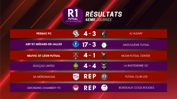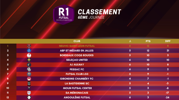 En tête du classement la semaine dernière, Aulnay se fait surprendre par Pessac FC, qui passe de la 8ème à la 6ème place. Abp Saint Medard Futsal-Football profite de son carton 17-3 pour surplomber les Coqs Rouges, tandis que As Neuvic Futsal récupère le fauteuil de leader pour la première fois de la saison.