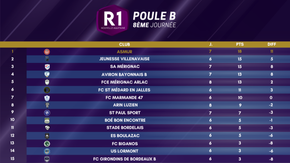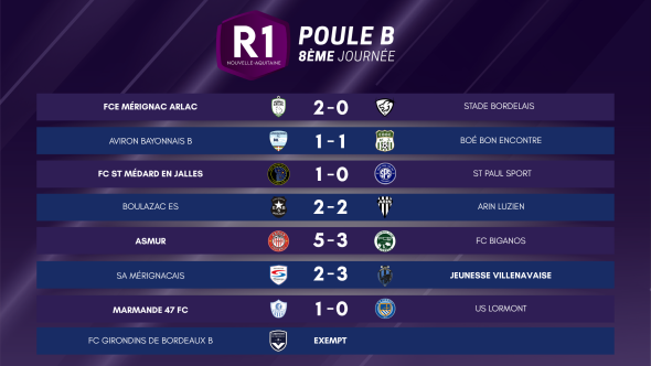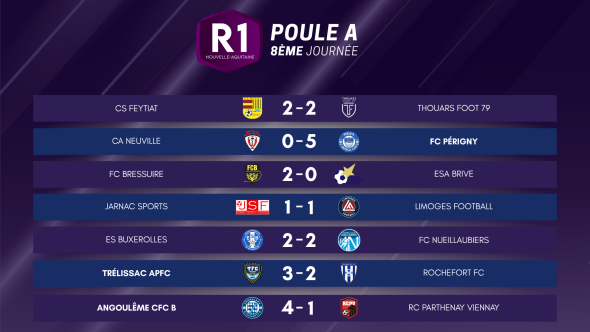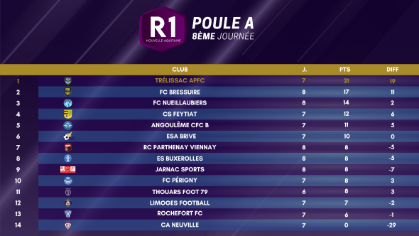 Dans la poule A, le Trélissac Football Club continue son chemin en tête du classement en s’imposant par un but d’écart face à Rochefort, malgré deux buts encaissés en fin de match. La victoire fracassante du Football Club de Périgny lui permet de grimper de deux places.